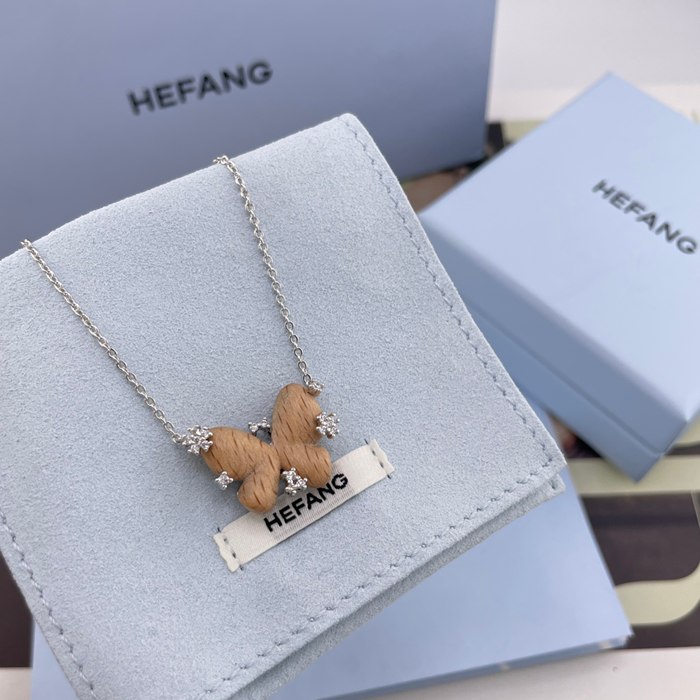 • ネックレス HF スターリングウッド×バタフライネックレス — 榛の木を使用、蝶の羽根は手彫り、木目は1点もの、小花にはジルコニ