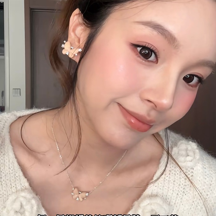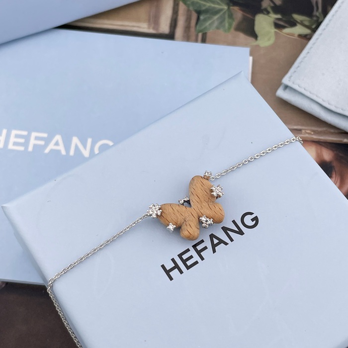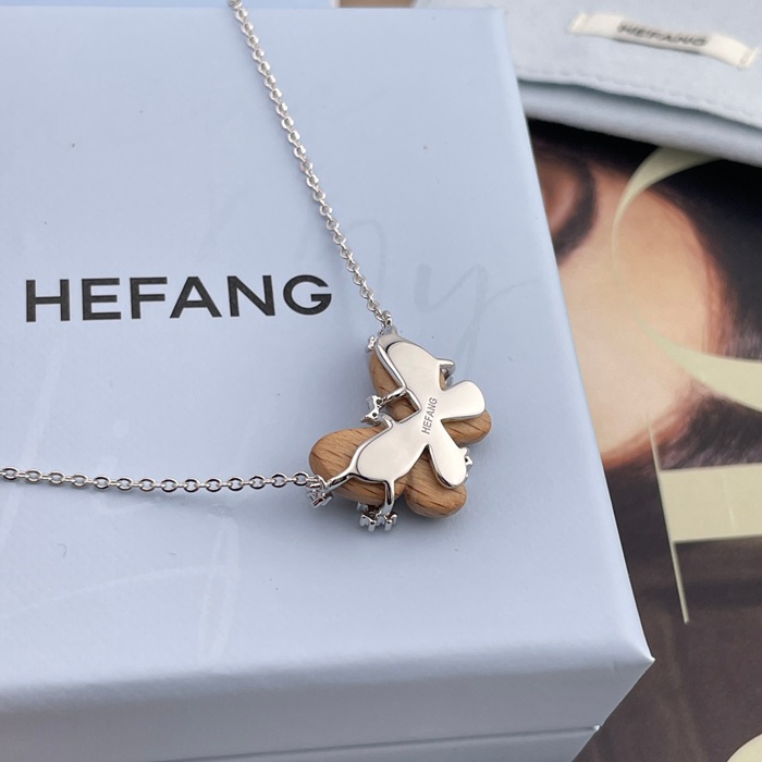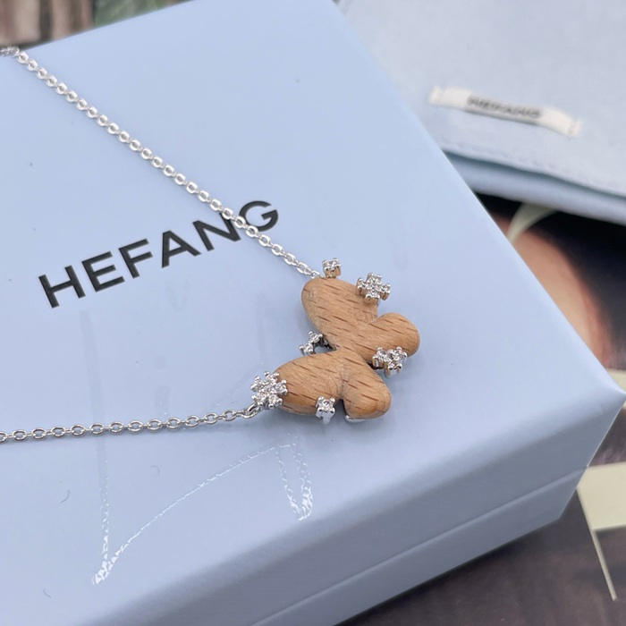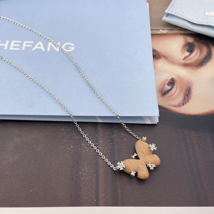 ネックレス HF スターリングウッド×バタフライネックレス — 榛の木を使用、蝶の羽根は手彫り、木目は1点もの、小花にはジルコニ