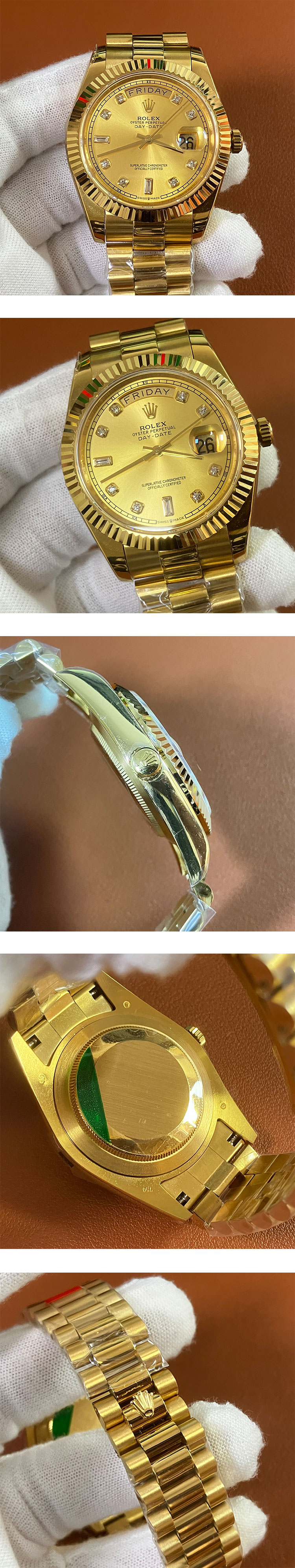 文字盤: ゴールド 10ポイントダイヤ文字盤、曜日デイト表示、ルーレット刻印(ROLEX文字&王冠)
