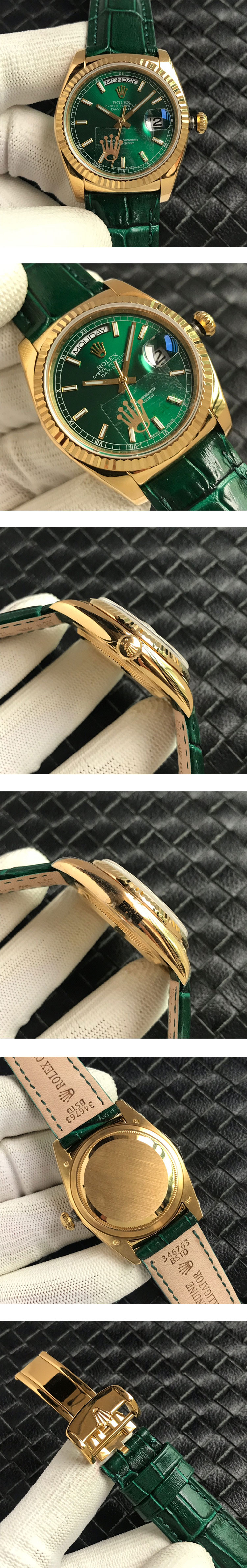 文字盤:グリーン文字盤、ゴールドインデックス(2重夜光)、12時位置曜日表示、3時位置カレンダー表示(2.5倍確率)