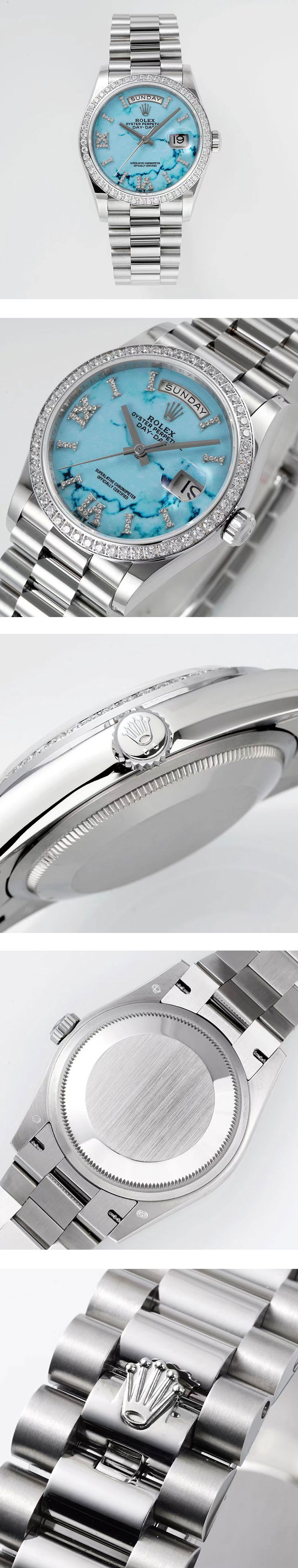 文字盤: ターコイズ文字盤、曜日表示、デイト表示、ルーレット刻印(ROLEX文字&王冠)