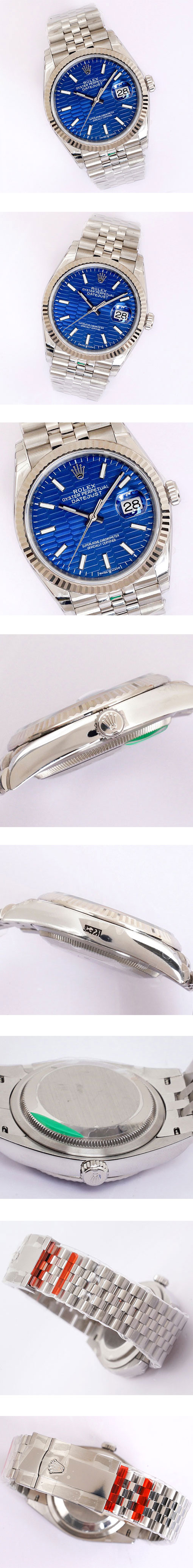 文字盤: ブルー文字盤、スーパールミナス(夜光)時字、3字位置2.5倍拡大率カレンダー、ルーレット刻印有り