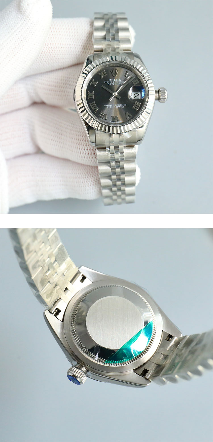 文字盤: ダークグレー ローマ文字盤、ROLEX&王冠のルーレット刻印、2.5倍拡大率カレンダー表示