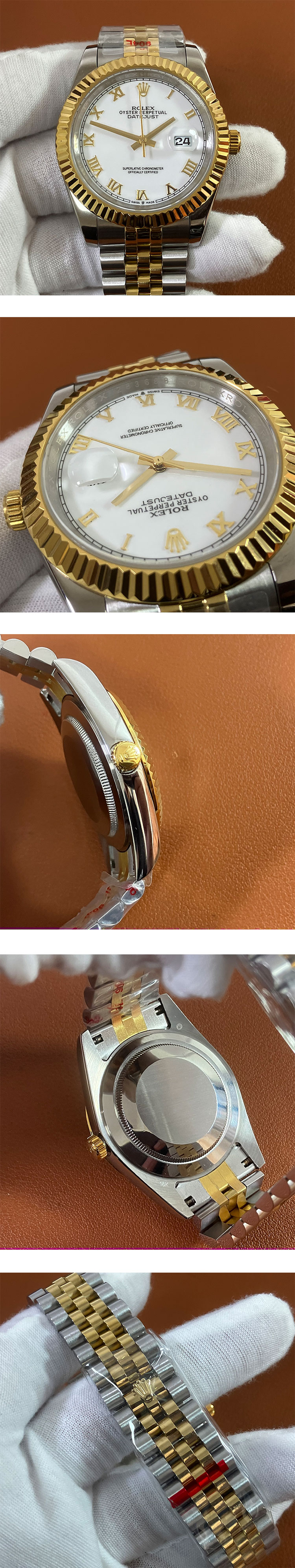 文字盤: ホワイト文字盤、ローマ数字時字、ROLEX&王冠のルーレット刻印、2.5倍拡大率カレンダー表示