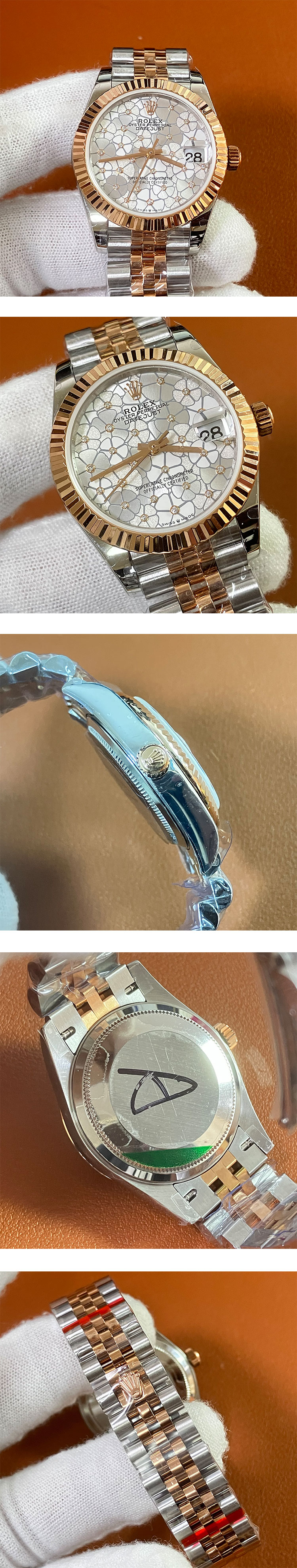 文字盘: シルバーフローラルモチーフ文字盤、デイト拡大率2.5倍、ROLEX王冠ルーレット刻印ある