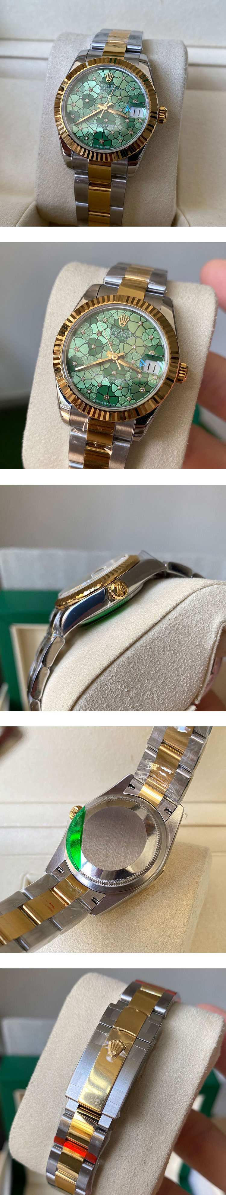 文字盤: オリーブグリーン フローラルモチーフ文字盤、ROLEX&王冠のルーレット刻印ある