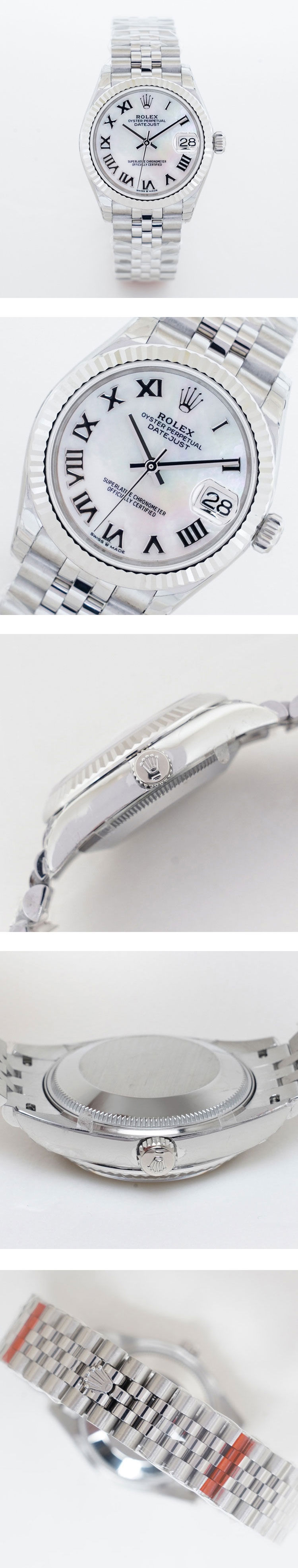 文字盘: ホワイト シェル文字盤、デイト拡大率2.5倍、ROLEX王冠ルーレット刻印ある