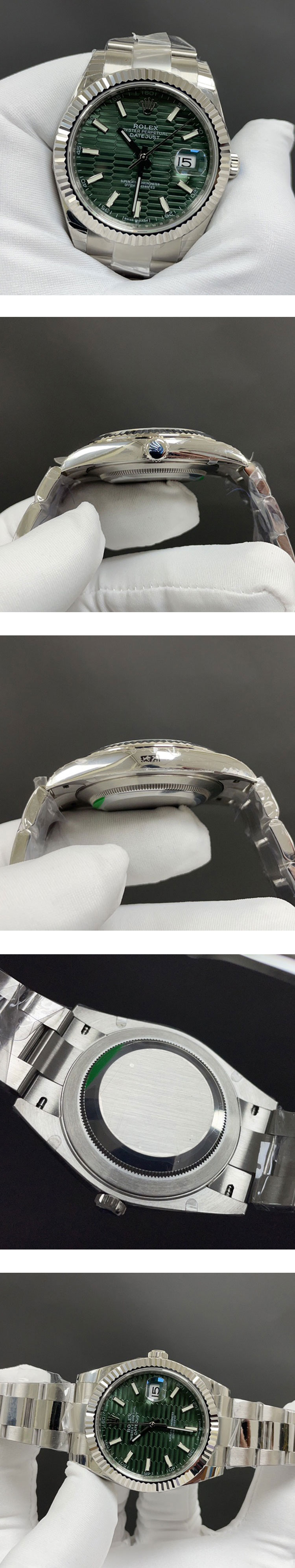文字盘: ミントグリーン フルーテッドモチーフ文字盤、デイト拡大率2.5倍、ROLEX王冠ルーレット刻印ある