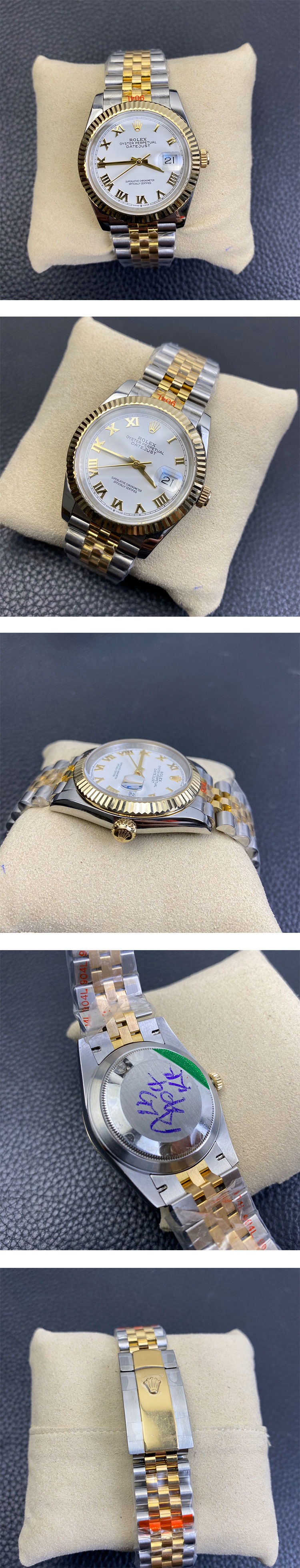 文字盤: ホワイトダイヤル(ローマ時字)、ゴールデンインデックス、ルーレット刻印(ROLEX王冠)、デイト表示
