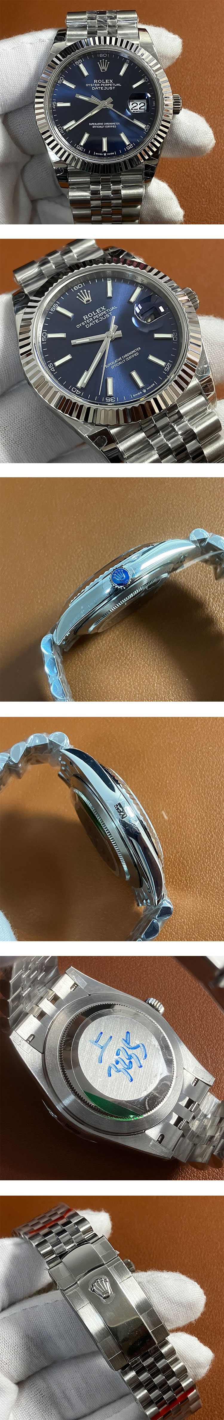 文字盤: ダークブルー文字盤、文字盤ルーレット(ROLEX&王冠)刻印、3時位置2.5倍拡大率カレンダー表示