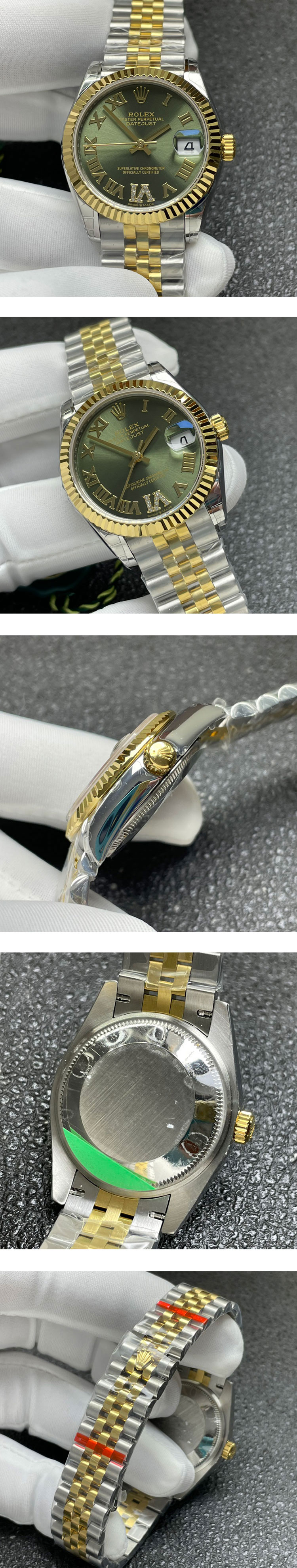 文字盤: グリーンVIダイヤ文字盤、ROLEX&王冠のルーレット刻印ある