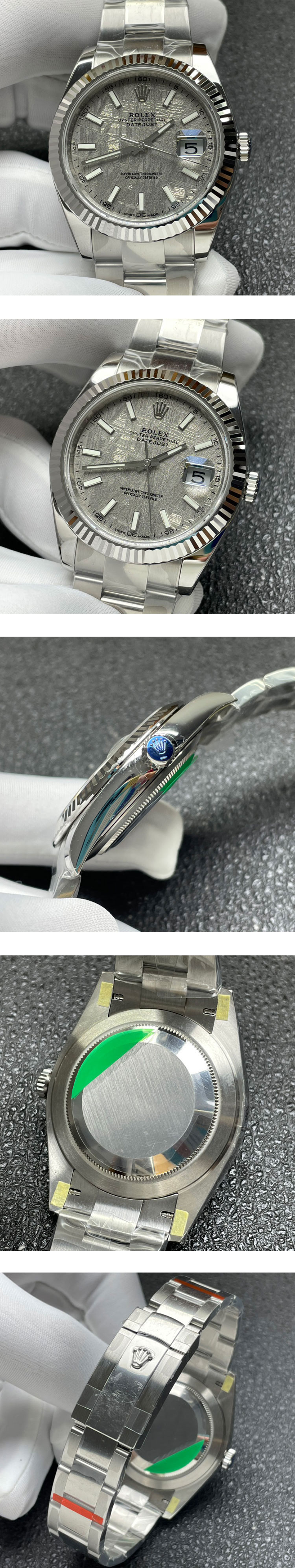 文字盤: メテオライト文字盤、ルーレット刻印(ROLEX&王冠)、2.5倍拡大率カレンダーレンズ