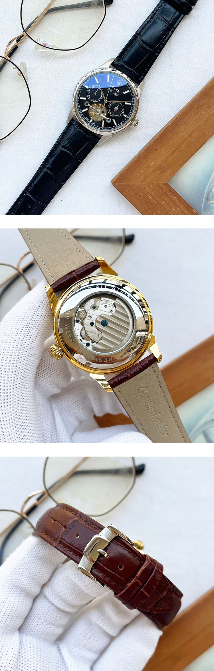 ダイヤル:3時位置カレンダー表示、9時位置月表示、12時位置曜日表示、ブラック文字盤、バーインデックスゴールド枠夜光