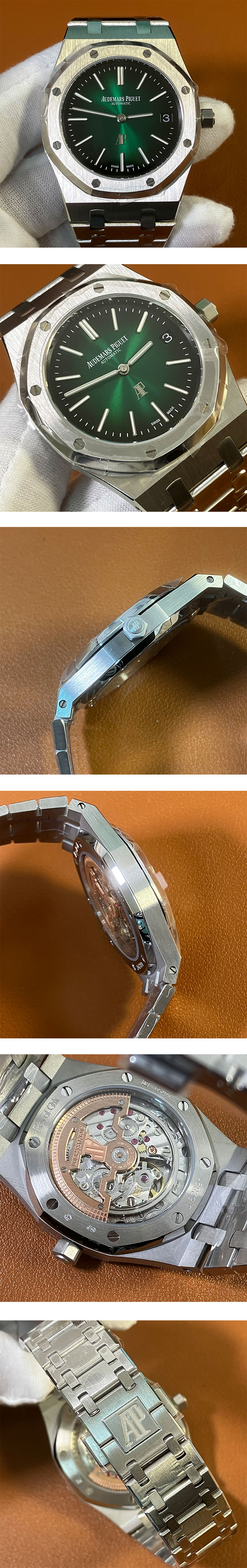 文字盤: スモークグリーン文字盤、3時位置カレンダー表示、夜光付きシルバーインデックス