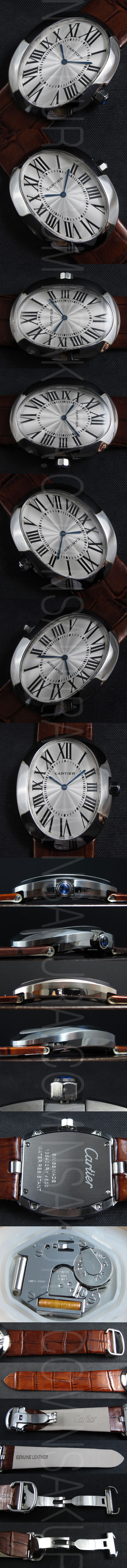 文字盤:ホワイト文字盤、クロノメーター、黒インデックス、ローマ数字時字、7字位置ローマ数字にカルティエロゴある