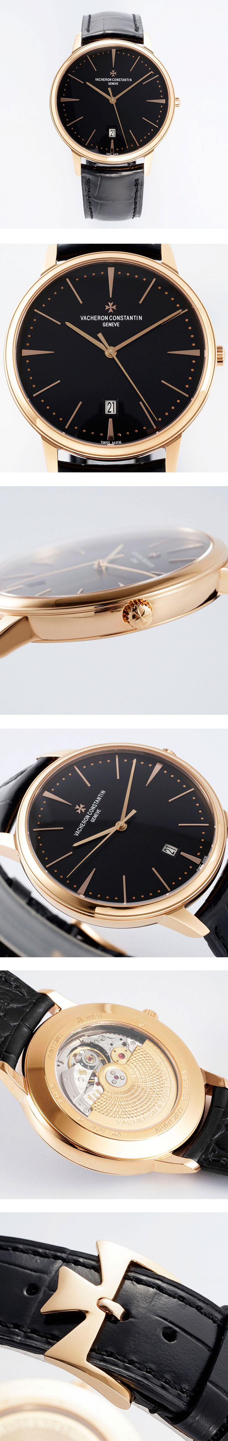 文字盤: ブラックダイヤル、18Kピンクゴールドインデックス、6字位置デイト表示
