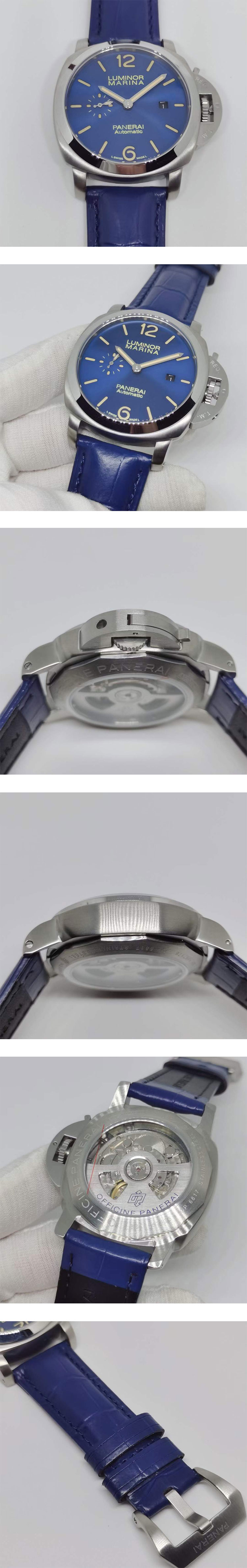文字盤:ブルー文字盤、ルミナスインデックス、9時位置時刻秒針、3時位置カレンダー表示