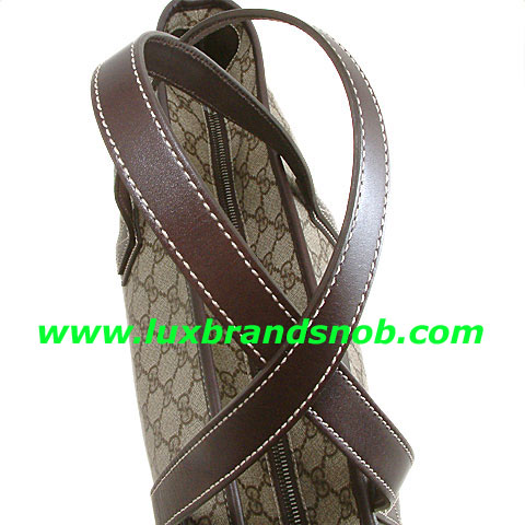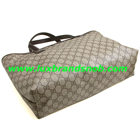 This Gucci tote bag 211120 made of beige/ebony GG plus with Brown leather trim ruthenium hardware double handles with 20cm drop zip-top closure interior pocket.