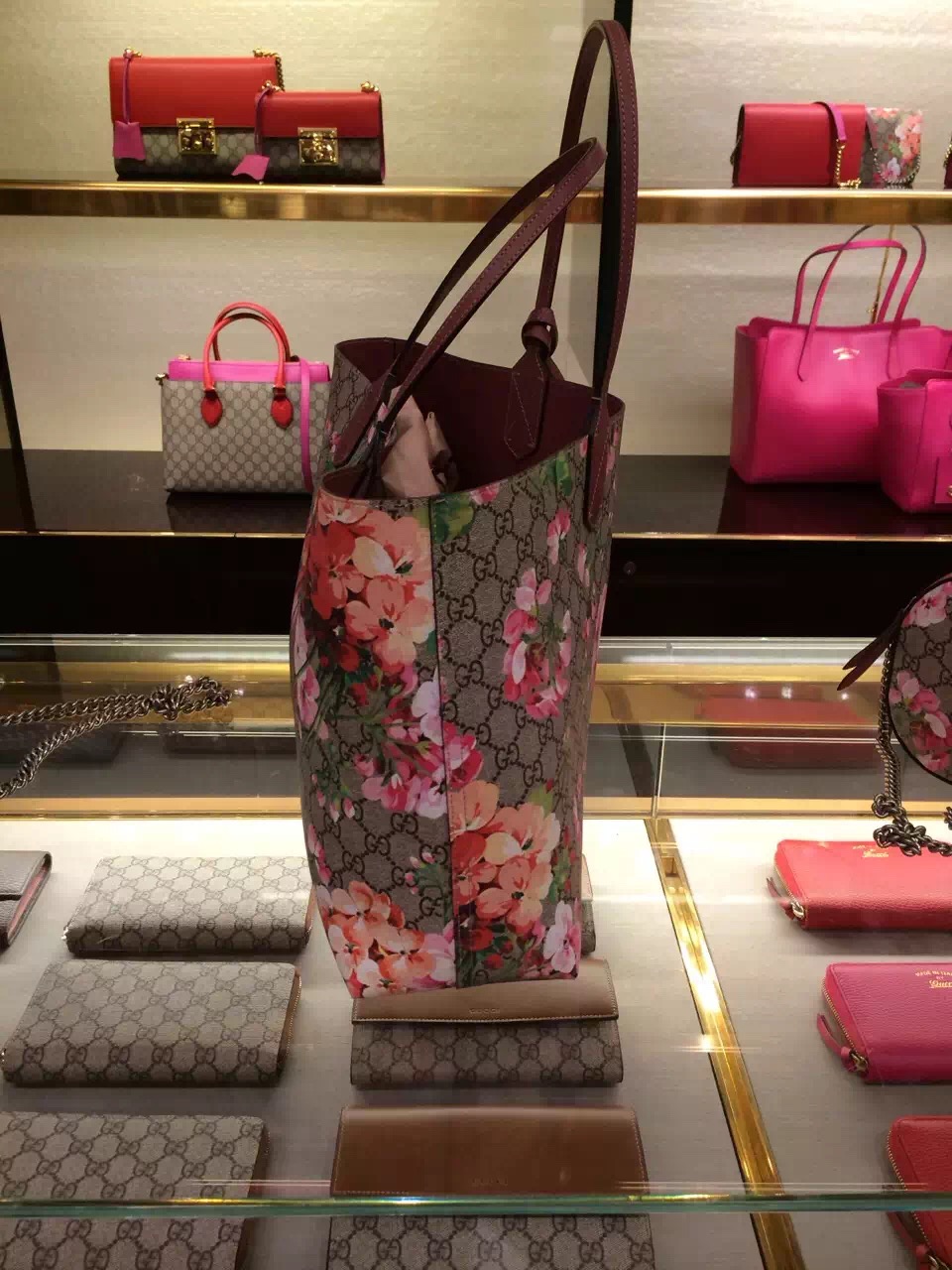 Gucci Tote Bag 368568 Rose Featuring our signature GG Blooms print on one side and solid leather on the other, this medium size tote is made with our innovative reversible leather, patented exclusively to Gucci.