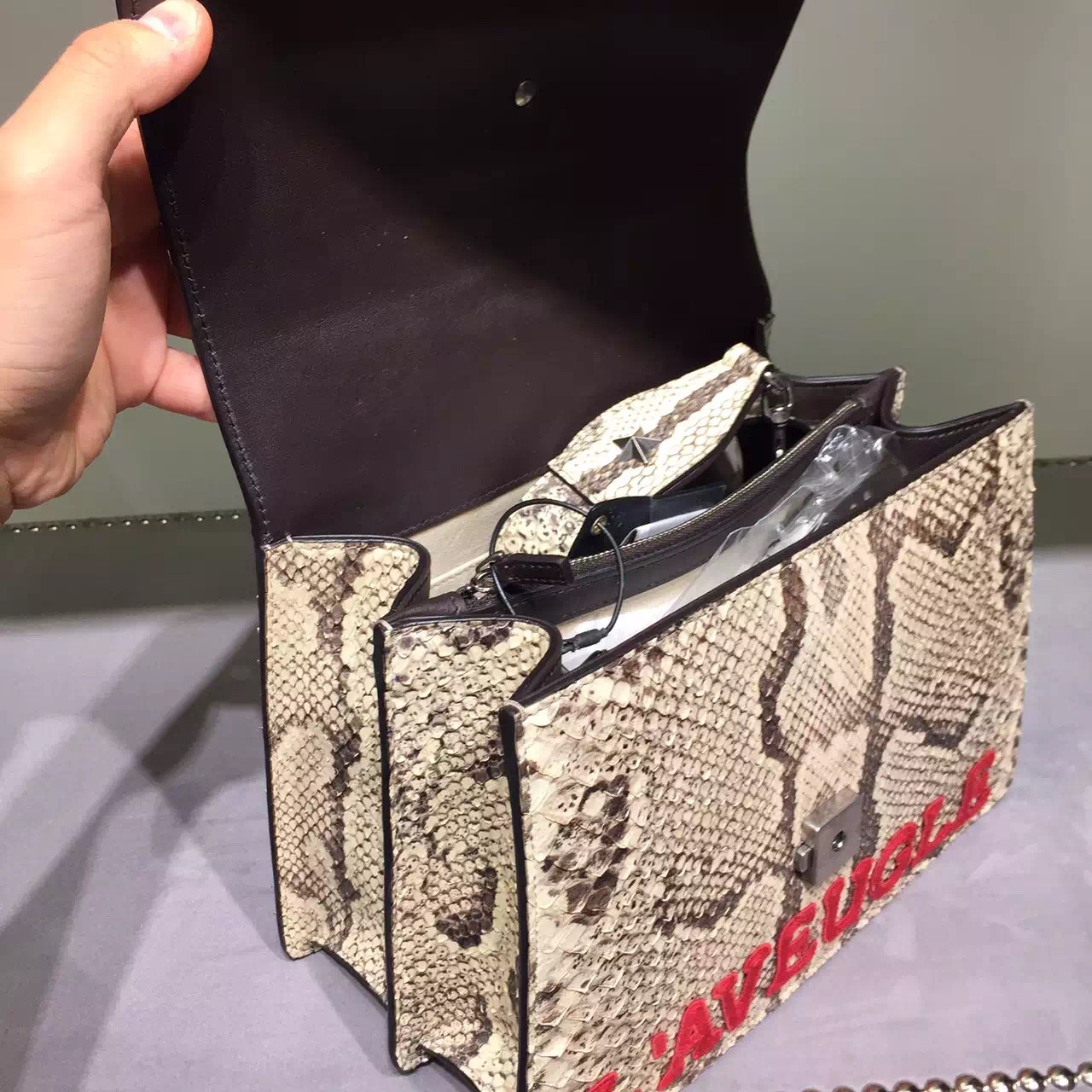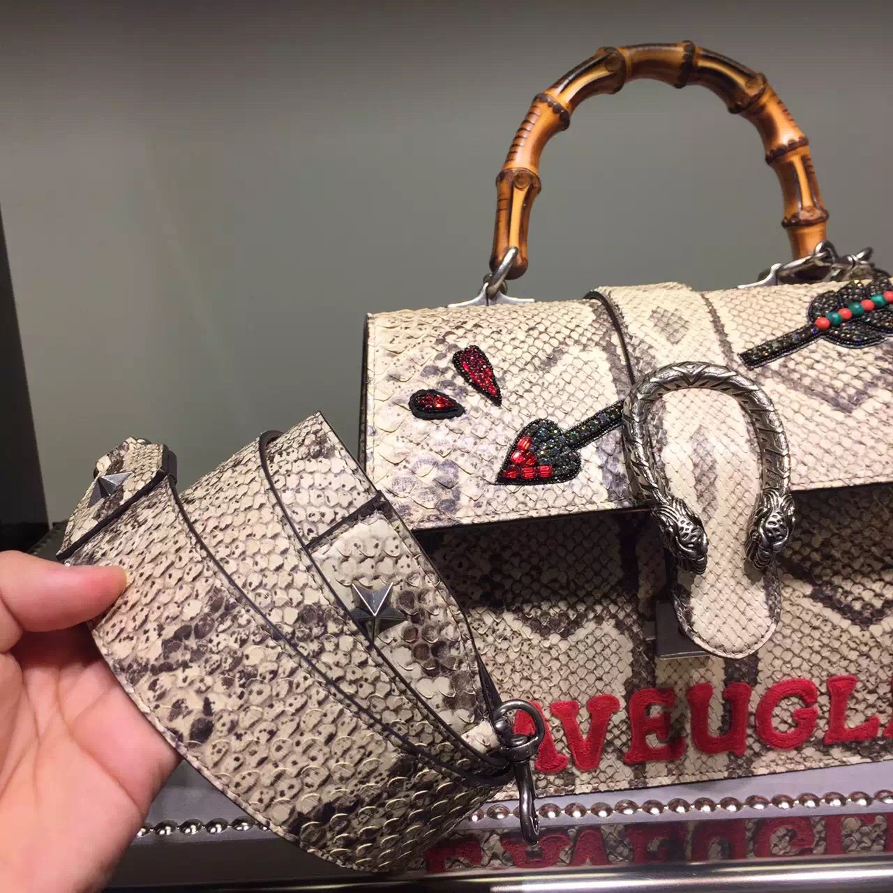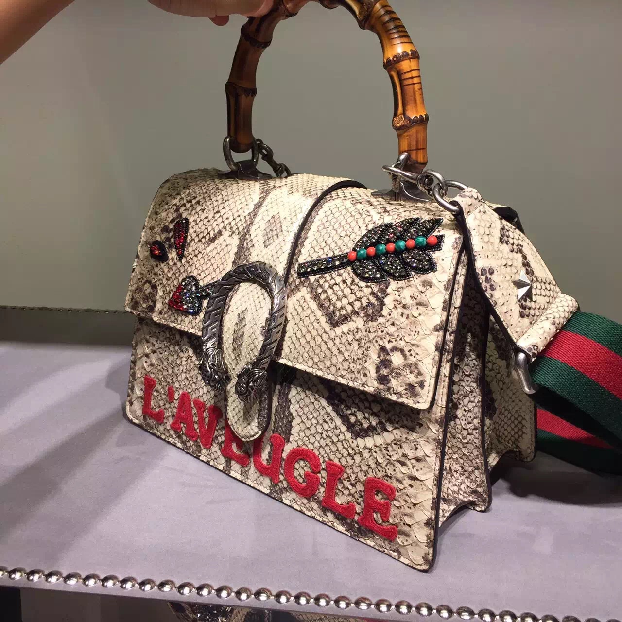 A structured contrast Dionysus bag in python with the textured tiger head spur closure-a unique detail referencing the Greek god Dionysus, who in myth is said to have crossed the river Tigris on a tiger sent to him by Zeus. Includes two interchangeable straps, a python strap and a signature nylon Web strap.