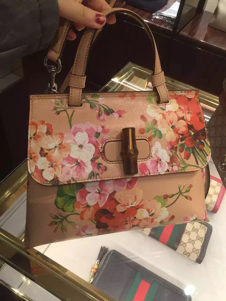 The small Bamboo Daily top handle bag has a black enamel bamboo closure and a detachable shoulder strap. Made in a natural grain leather with our blooms print.