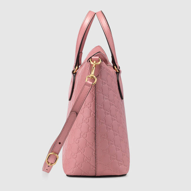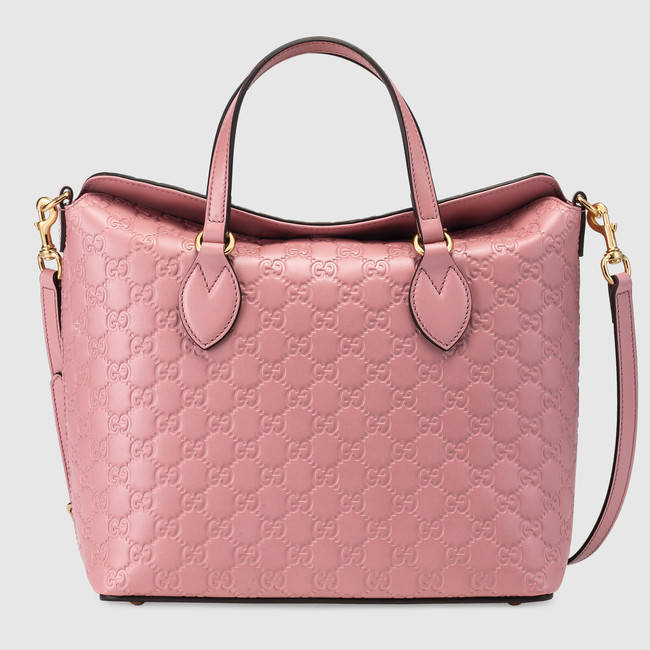 Gucci Signature Bag 428226 Candy Pink has a fold over top for an everyday look with a luxurious feel. Made in heat debossed Gucci Signature leather resulting in a defined print with a firm texture.