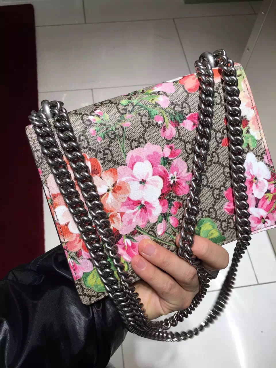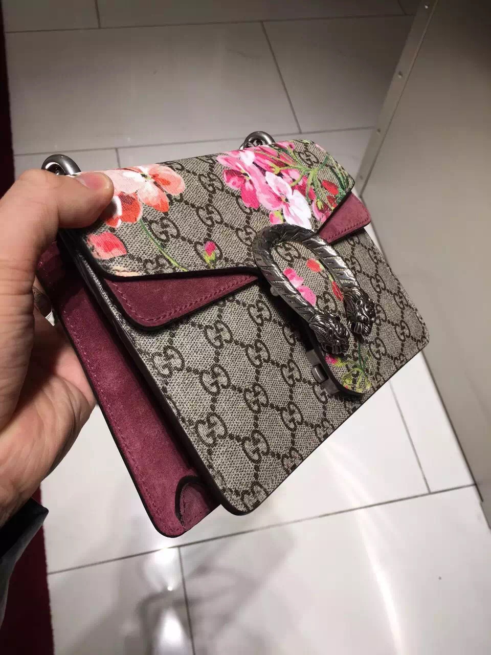 A mini Gucci Dionysus Bag with our textured tiger head spur closure in Blooms print supreme canvas. The sliding chain strap can be worn multiple ways, changing between a shoulder and a top handle bag.