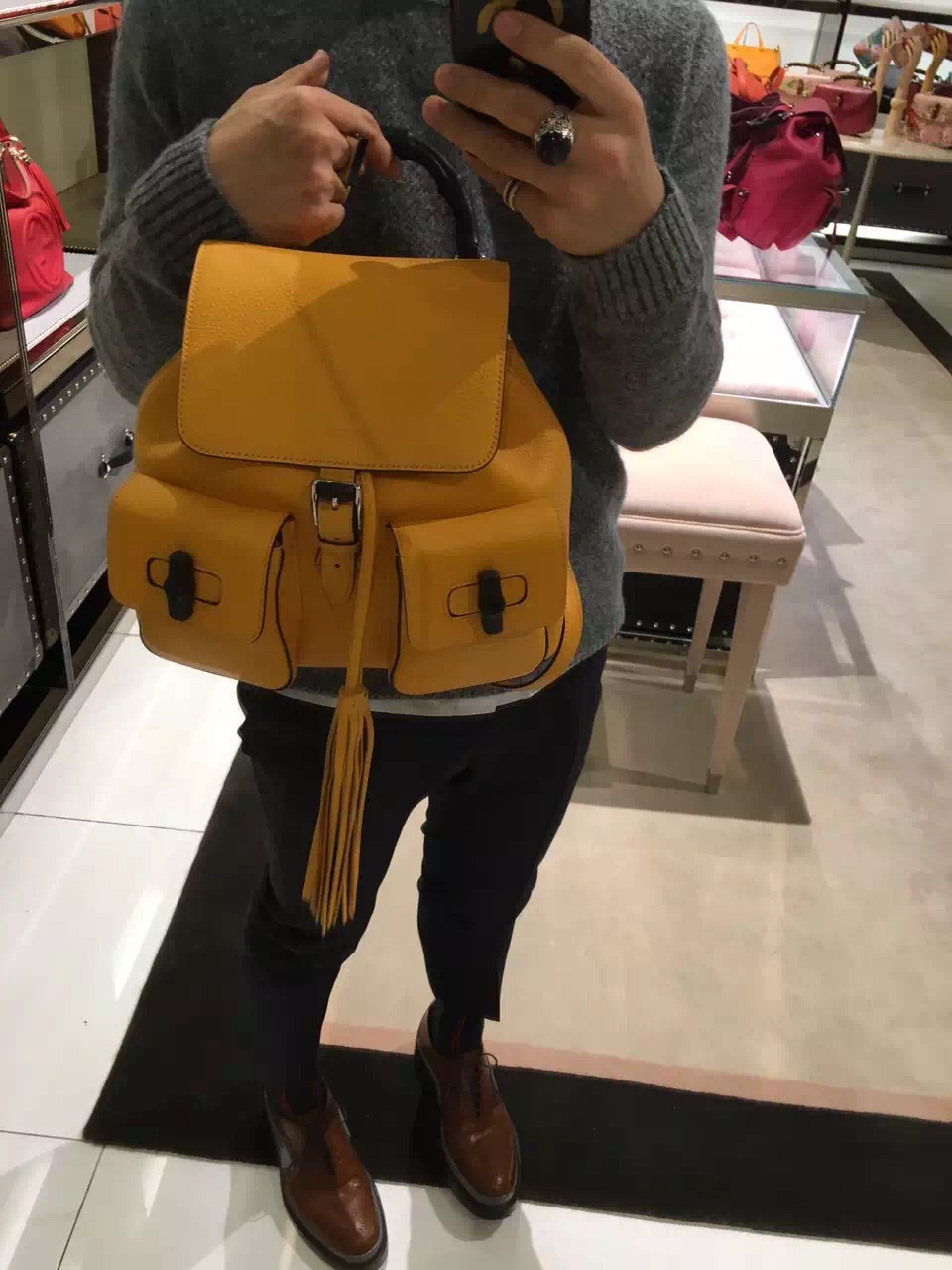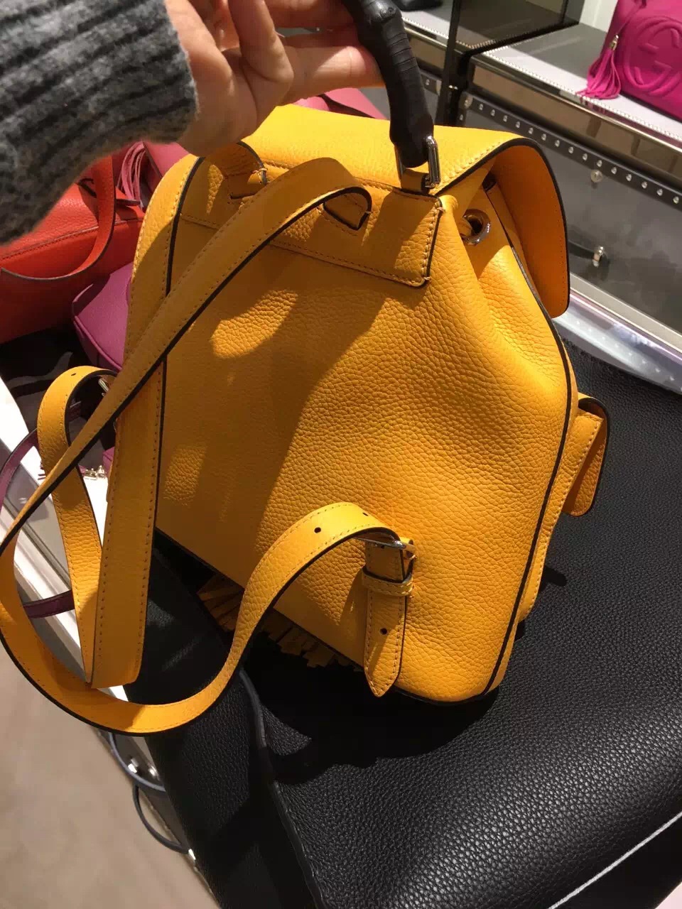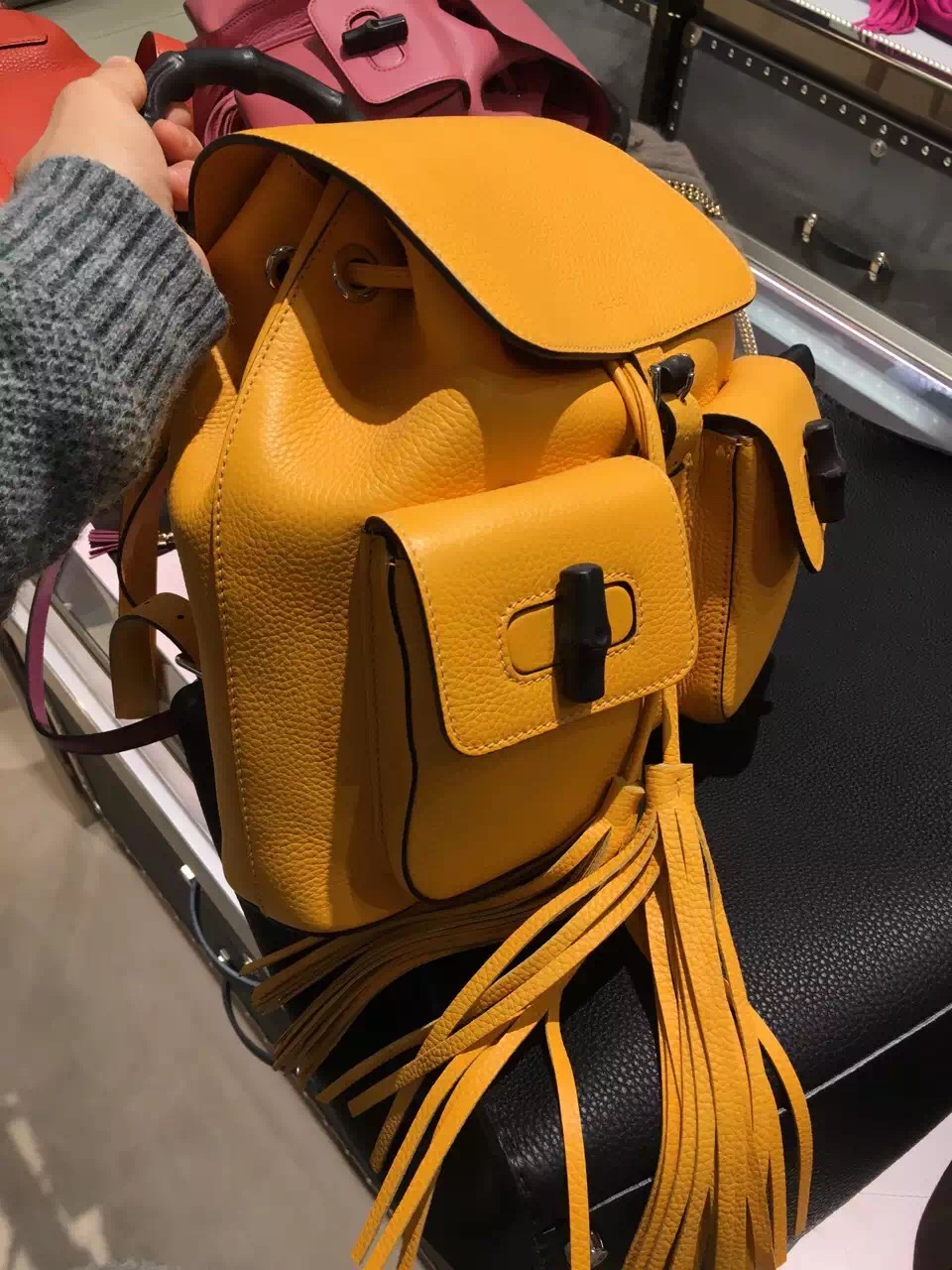 Gucci bamboo backpack 370833 The Bamboo Sac backpack has two front pockets and bamboo tassel detail. Made in one of signature leathers, noted for its softness, elasticity and light weight.