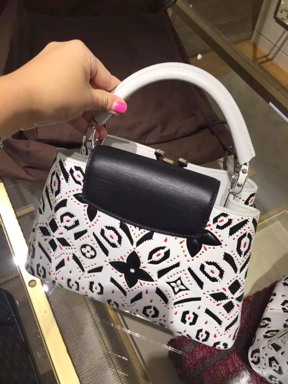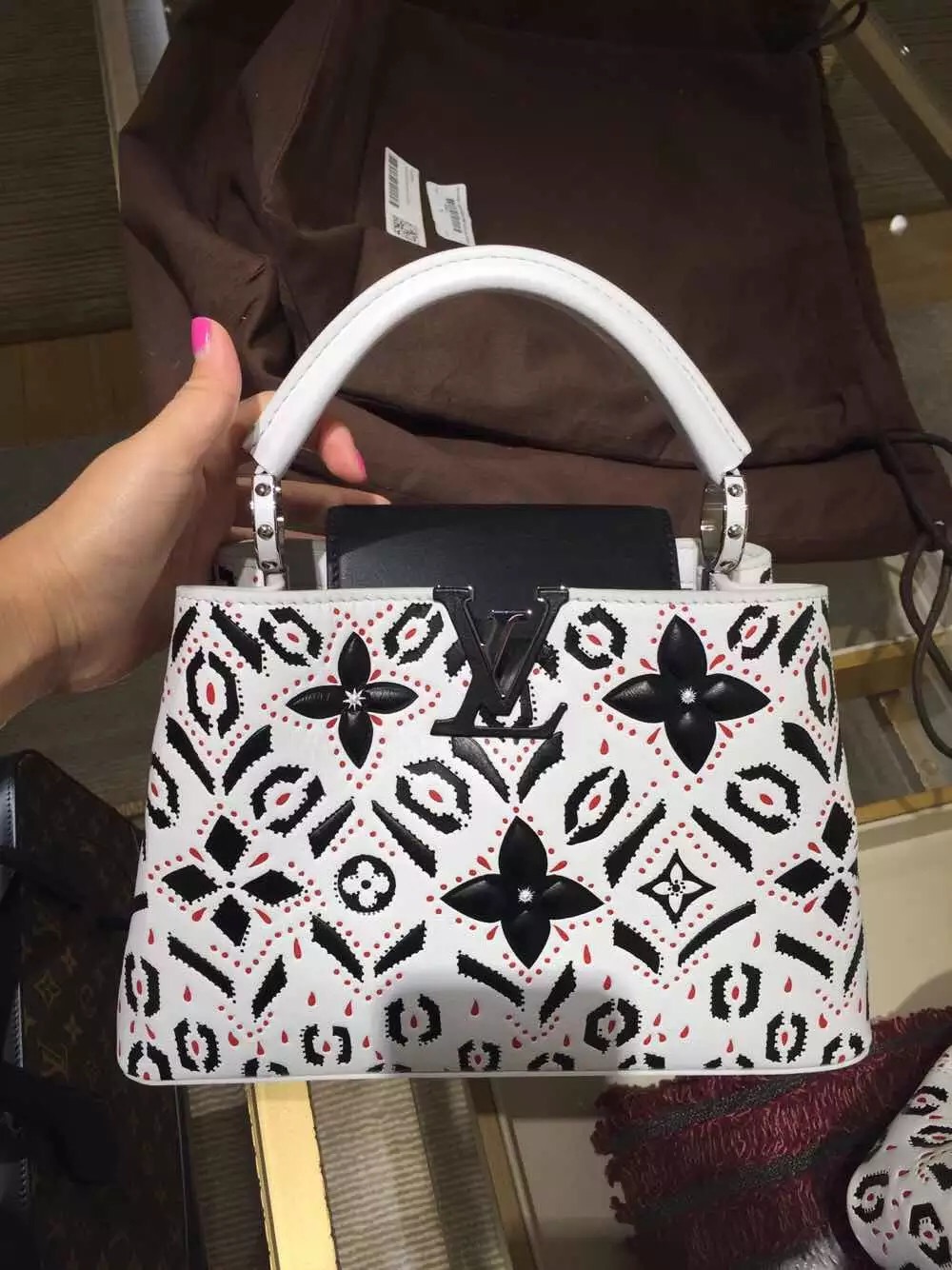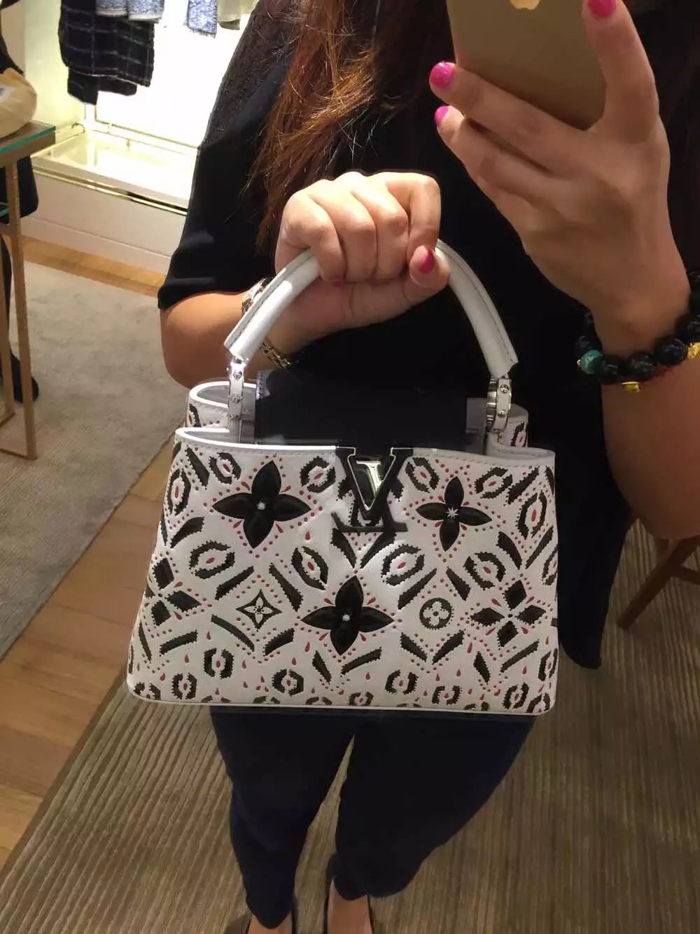 The iconic bag’s pure silhouette lends itself to artful variations, like this fetching new Capucines BB. Decidedly on-trend with its exclusive materials and detailing, this light, sophisticated bag can be worn in a host of ways: over shoulder or on the crook of the elbow, cross-body, with the flap inside, to display the distinctive leather-covered LV signature, or out, to show the delicate Monogram flower motif.