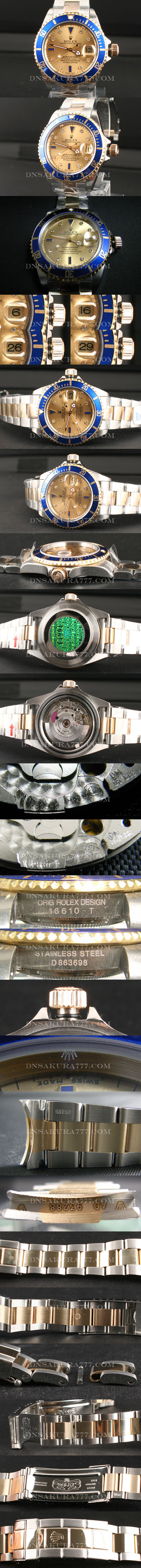 最新改良 Swiss ETA社 白2836-2Movement 搭載  毎秒8振動1時間28800振動 文字盤: ゴールド文字盤、ダイヤモンドインデックス、2.5倍拡大率カレンダー ベゼル: セラミックベゼル(ブルー) サイズ: ケース40㎜、ケース厚13.5㎜、重量130g 刻 印: Ref刻印、ムーブメント刻印、ベルト刻印、バックル刻印など