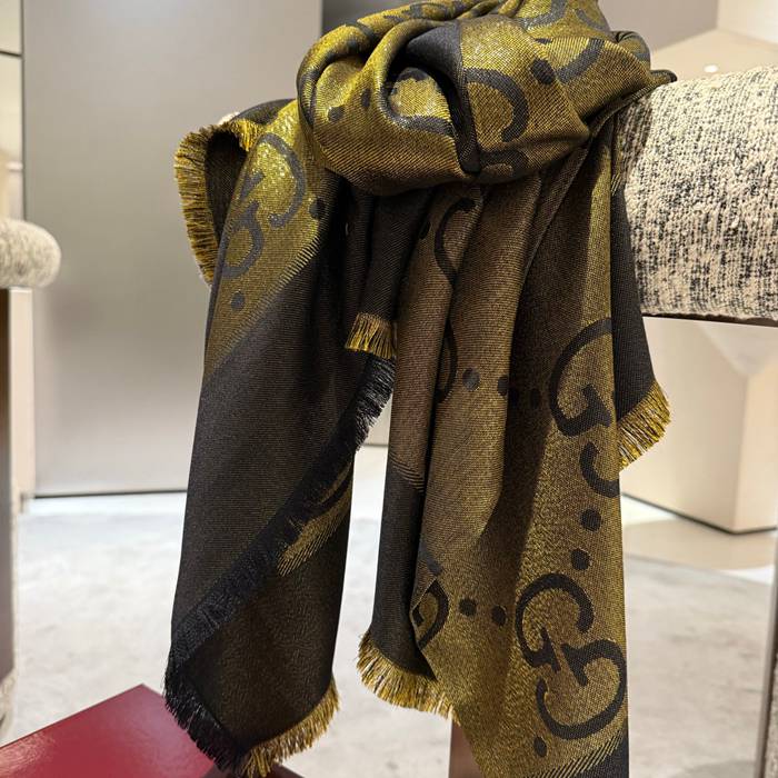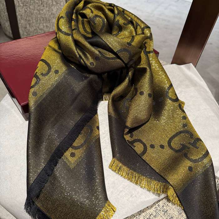 グッチ GG金糸提花ストール140。100%シルクベロア、金糸 140x140cm