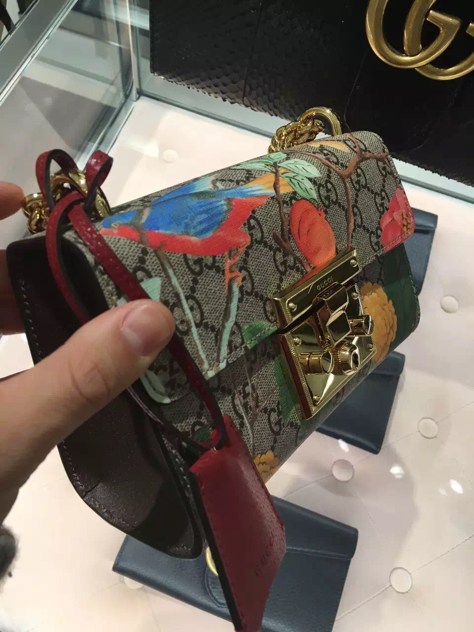 Gucci padlock bag 409487 with a leather top and our key lock closure. The sliding chain strap can be worn multiple ways, changing between a shoulder and a top handle bag. Our new Gucci Tian print features a contemporary floral motif inspired by Chinese landscapes depicted on 18th-century tapestries and screens. The floral pattern is made up of flowers, insects and birds-including dragonflies, butterflies and hummingbirds. The plants and creatures are represented through light and quick brushstroke-style graphics, with a three-dimensional effect printed on our GG Supreme canvas.