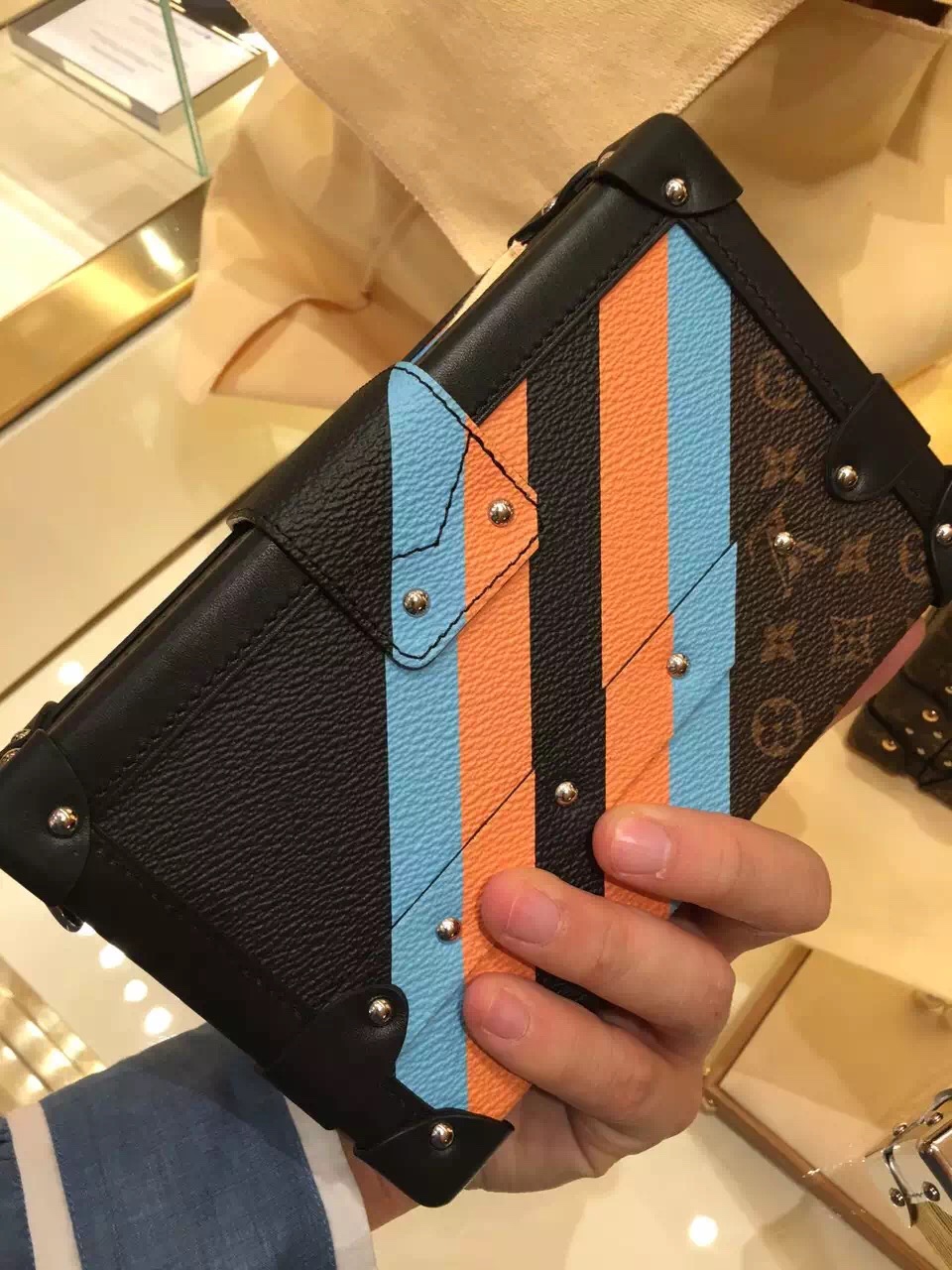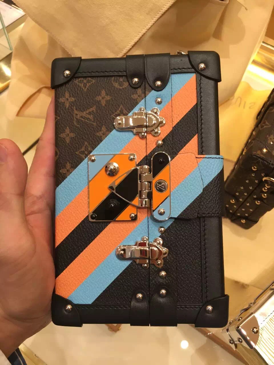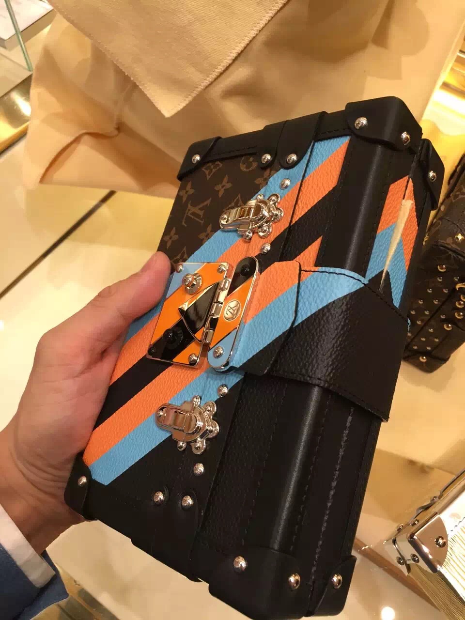 Louis Vuitton Petite Malle A tiny trunk with all the hallmarks of House savoir-faire, this edition of the Petite Malle displays colour-block stripes, inspired by those painted on personalised historic Vuitton luggage. This polished piece can be carried as a clutch or cross-body for a day to evening use.