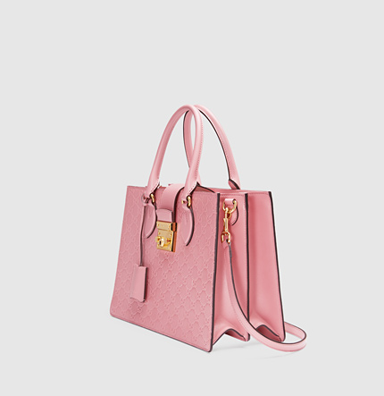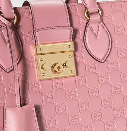 Gucci Padlock Signature Top Handle Bag 428207 pink, this small size top handle bag has our key lock closure pulled straight from the archives, the key is placed in a leather key case that loops around handle. Made in our embossed Gucci Signature leather.